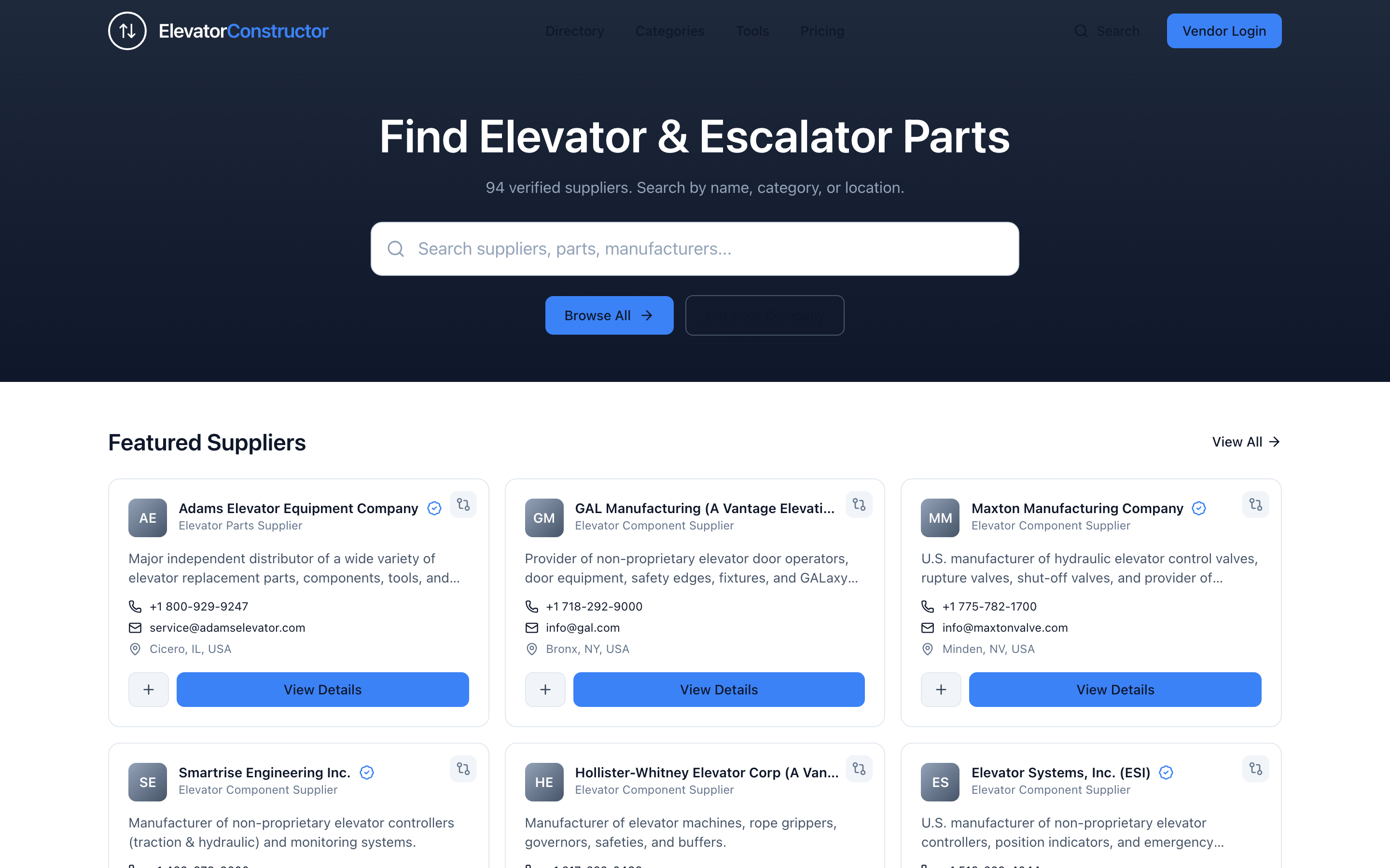 Searchable directory of 94+ verified elevator and escalator parts suppliers worldwide — search by name, category, or location