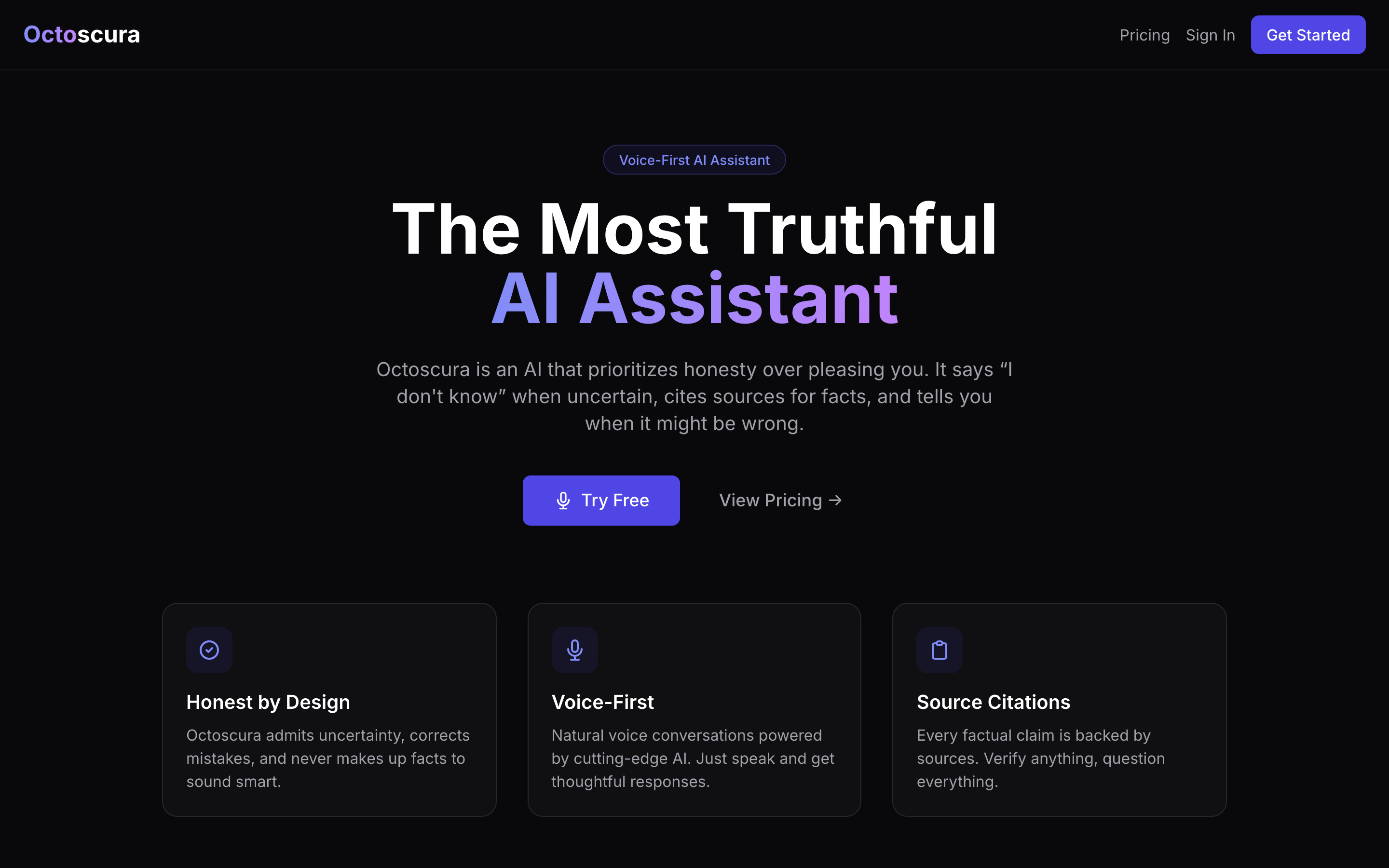 Voice-first AI assistant with honest, source-cited responses — full SaaS with auth, pricing, and dashboard
