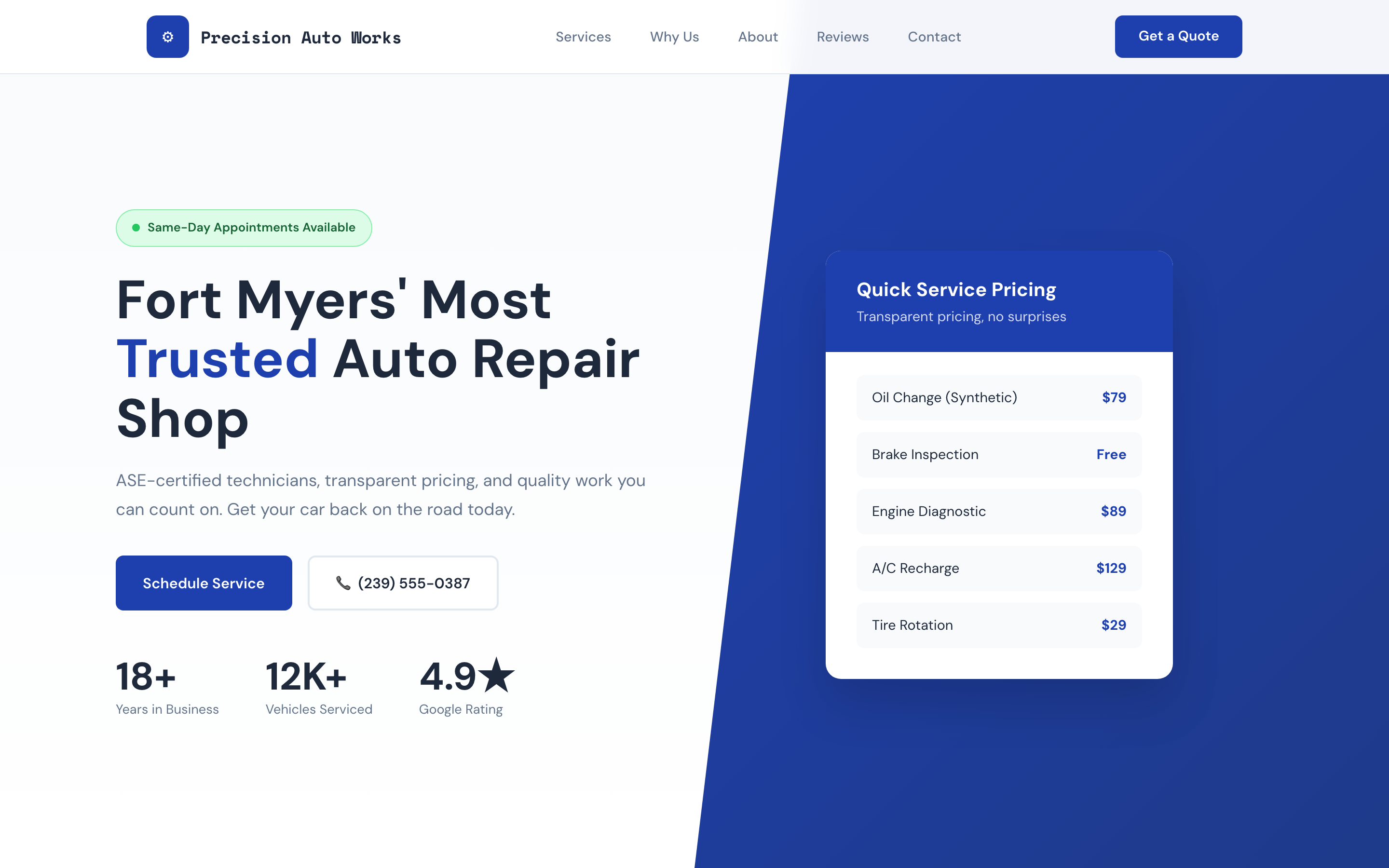 Service catalog, quote request form, certifications, and emergency CTA